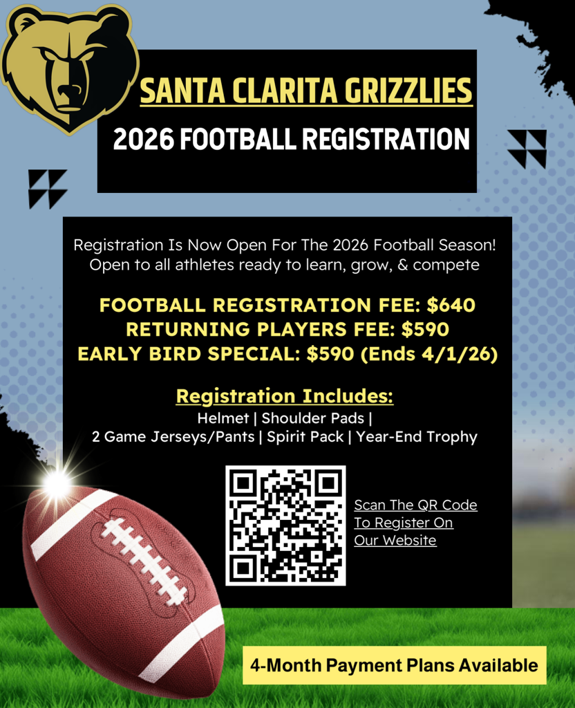 Welcome to the Santa Clarita Grizzlies Football and Cheer program webpage! We are thrilled to kick off our season with renewed enthusiasm and dedication. Here, you will find a wealth of useful information about our program, including details about our football and cheer teams, schedules, registration process, and much more. Whether you're a seasoned player or cheerleader, a proud parent, or someone looking to get involved in our vibrant community, we invite you to explore what the Santa Clarita Grizzlies have to offer. Get ready to join us on an exciting journey filled with teamwork, camaraderie, and unforgettable experiences both on and off the field. Join the Grizzlies and experience the pride, the family, the greatness!
